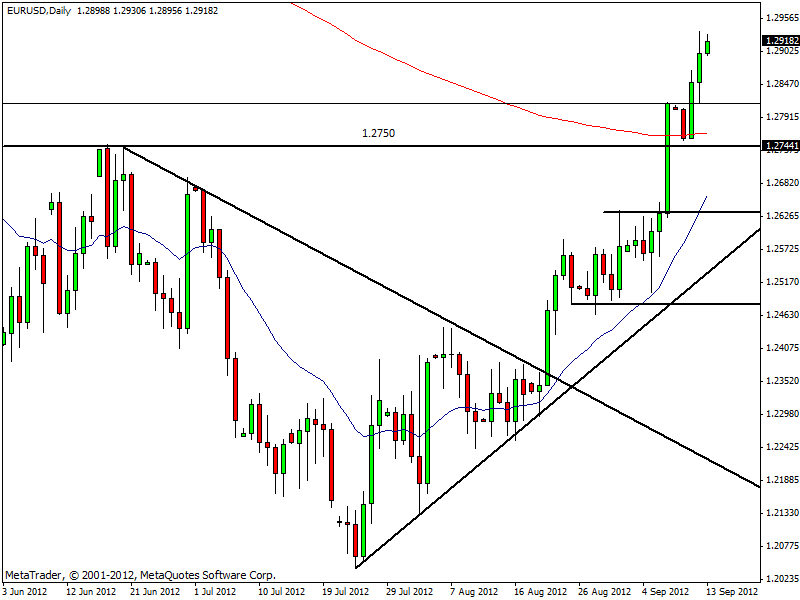 Nelle prossime ore euro/dollaro potrebbe nuovamente salire e sfondare quota 1,2940, aprendo così la strada ad un’ascesa molto robusta verso 1,30. L’annuncio del QE3 dovrebbe portare il cambio euro/dollaro a superare 11,30 entro stasera, mentre se Bernanke manterrà chiusi i rubinetti della liquidità è probabile un forte calo delle quotazioni.