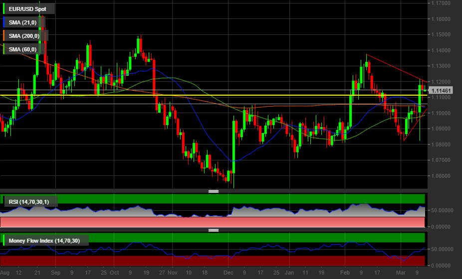 Gli indicatori tecnici invece lasciano intendere che la fase rialzista di giovedì non è ancora finita visto che sia il RSI che il MFI viaggiano al di sopra del valore di neutralità, puntando verso la zona di ipercomprato. Il supporto in colore giallo sembra aver retto allo storno di venerdì ed è verosimile che anche oggi si riprovi un test di tale livello fermo a quota 1,1113$.