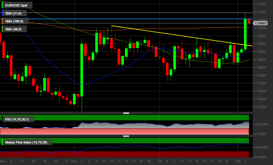 Il cambio Euro-Dollaro nella seduta di ieri è arrivato a toccare il massimo a 1,1145, rompendo così tutte le resistenze e la trendline ribassista di breve periodo. Gli investitori hanno puntato sull’Euro dopo che il dato ISM non-manifatturiero degli USA ha mostrato una contrazione ben oltre le attese, suggerendo così un allontanamento del rialzo dei tassi di interesse da parte della Federal Reserve a Marzo.