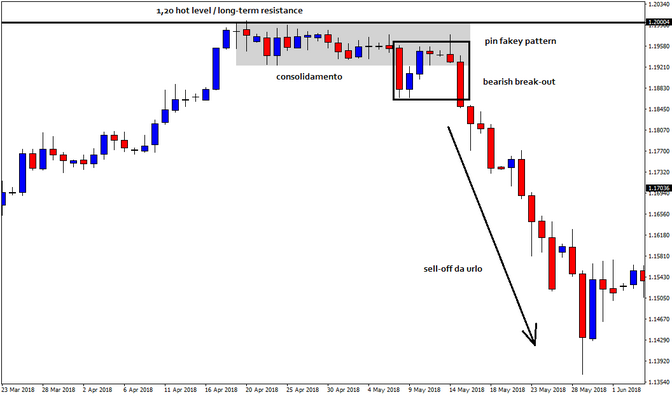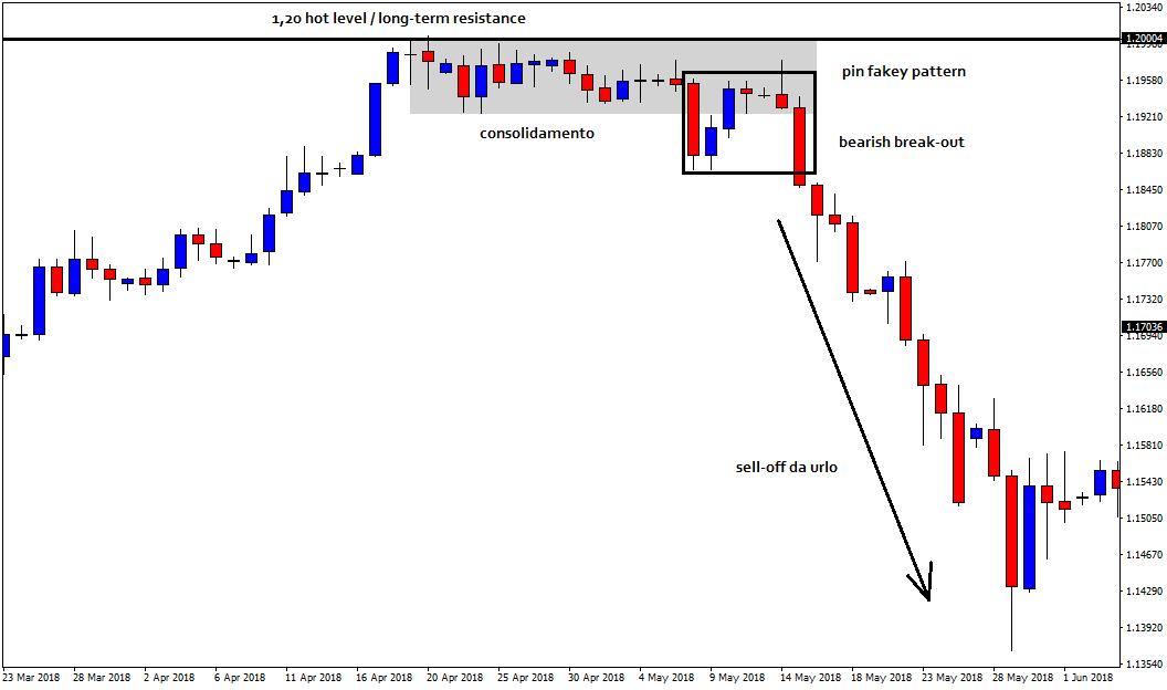 E’ una pin fakey, ovvero una pin bar con falso break-out di inside candles. Anche se non viene toccato nuovamente il livello di 1,20, abbiamo la formazione di un lower high (LH, massimo più basso): un indizio tecnico di certo non di poco conto. Il segnale ribassista è davvero notevole e nel giro di pochi giorni i prezzi passeranno da 1,1950 a 1,1350 circa. Ancora una volta questo cross viene interessato da un crollo clamoroso nel giro di pochissimo tempo.