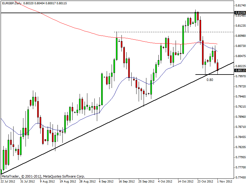 Il tasso di cambio euro/sterlina è tornata questa mattina sulla fondamentale area di supporto giornaliera posta a 0,80. Lo stesso livello era stato toccato il 26 ottobre. Dopo il pullback fino a 0,8074 è ripartito il trend ribassista, iniziato lo scorso 23 ottobre dopo che il giorno prima era stato toccato il massimo più alto degli ultimi 5 mesi e mezzo a 0,8164.