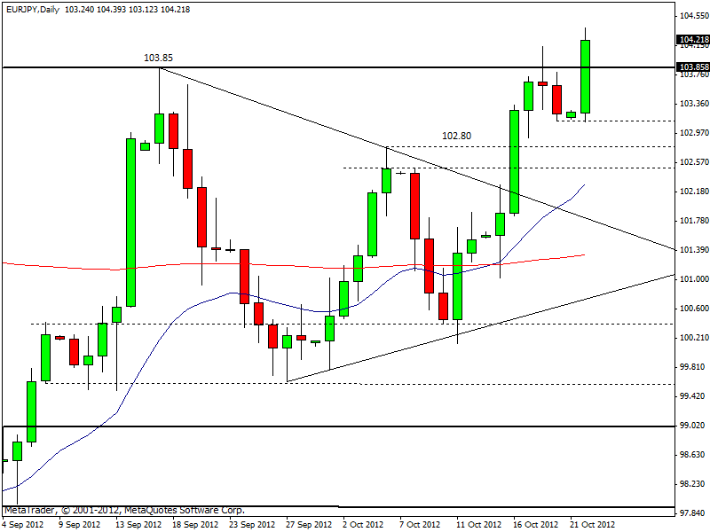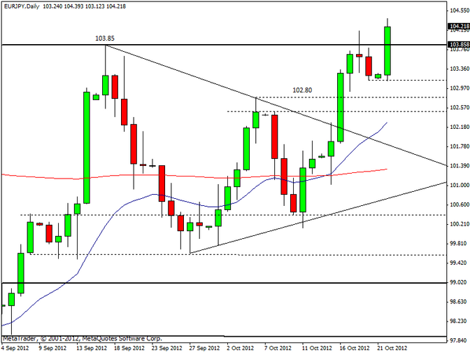 Il tasso di cambio euro/yen continua a salire con grande decisione, spingendosi fino a toccare un top intraday a 104,39. I prezzi sembrano essere in grado di mettersi per un pò di tempo alle spalle la resistenza chiave di 104, anche se il sentiment molto incerto sui mercati finanziari non allontana definitivamente la possibilità di un triplo massimo su base giornaliera.