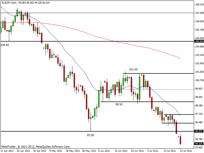 Il tasso di cambio euro/yen è sceso questa mattina sui minimi a 11 anni, toccando un bottom intraday temporaneo a 94,23. Il clima di avversione al rischio (risk off) sta accentuando la forza della divisa nipponica, mettendo così in preallarme le autorità monetarie giapponesi che potrebbero decidere di intervenire nei prossimi giorni per evitare nuovi deprezzamenti del cambio.