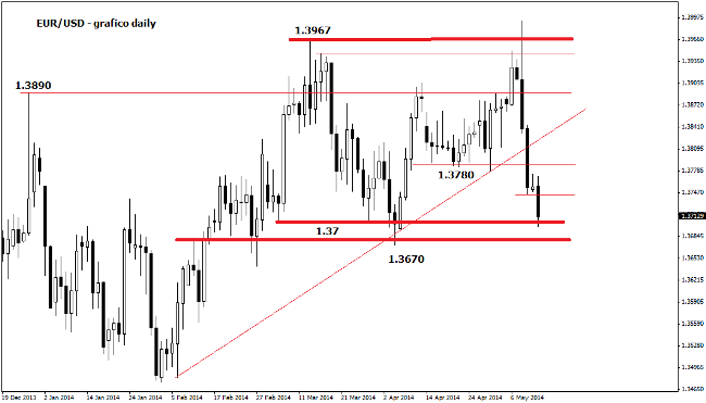 Sul forex il tasso di cambio euro/dollaro ha accelerato al ribasso con decisione, subito dopo la pubblicazione del brutto dato dello ZEW tedesco. I prezzi sono scesi fin sotto 1,37, toccando il minimo più basso da oltre un mese. Da un punto di vista tecnico, il rafforzamento dello scenario ribassista dovrebbe favorire un ulteriore approfondimento bearish verso i supporti di area 1,3670 – 1,3650, anche se non va esclusa una reazione dal supporto di 1,37. La ripresa del trend rialzista di medio periodo appare comunque molto problematico, per cui potrebbe esserci solo un rimbalzo tecnico nei prossimi giorni fino a 1,3780 – 1,38 prima di una nuova discesa.