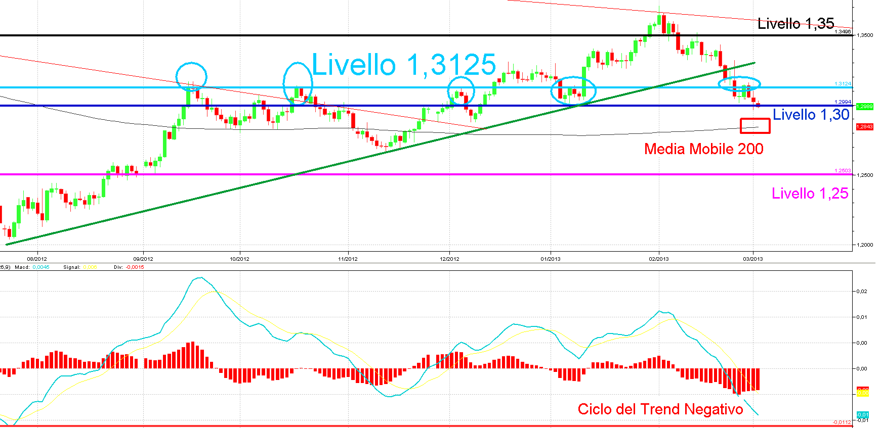 E se facciamo la media delle medie? Viene il valore di 1,3125. Questo livello effettivamente graficamente è stato testato più volte del sottostante supporto di 1,30, quindi forse più attendibile come resistenza/supporto (dipende da quando lo consideriamo). Il quadro attuale, a livello grafico, vede la seguente impostazione: A) test supporto 1,3 B) attrattività media mobile a 200 periodi C) MACD segnala trend ciclico di fondo negativo. Cosa fare?