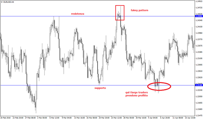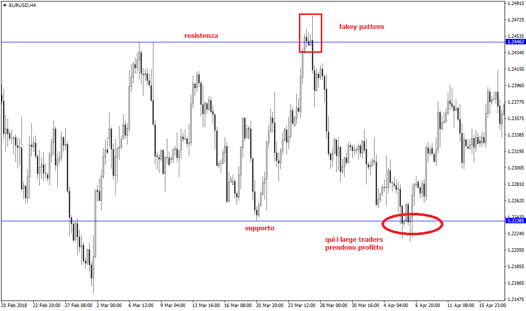 Per comprendere meglio questo pattern andiamo a dare un’occhiata al grafico a 4 ore del tasso di cambio euro/dollaro, sul quale sono stati tracciati i livelli di resistenza e di supporto principali. Il fakey pattern rappresenta un segnale short importante, in grado di generare una violenta discesa della quotazione di oltre 200 pip dai top di periodo. Il cambio EUR/USD scenderà fino in area 1,2220 dopo aver toccato un massimo relativo poco sopra 1,2470, in un contesto generale di mercato caratterizzato da una fase di trading range.