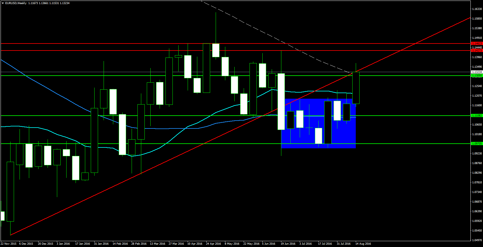 Il rettangolo blu, evidenziato nel seguente grafico settimanale, delimita i confini del range di prezzo al di fuori del quale EUR/USD si mostrava incapace di uscire, prima dell’arrivo dell’ultima candela: