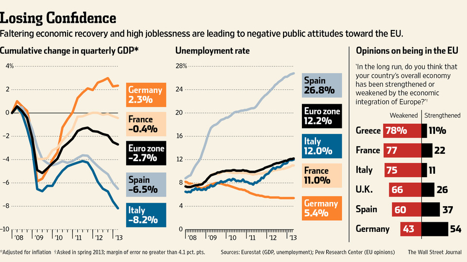 La duratura crisi economica che colpisce buona parte del vecchio continente infiamma gli animi contro l’UE, così come emerge dai sondaggi politici, nella tendenza ad incolpare l’Unione europea per la disoccupazione elevata e per i sacrifici imposti sui bilanci.