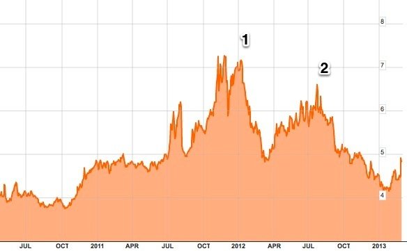 Il primo picco, alla fine del 2011, è stato placato quando la BCE ha annunciato il suo programma di 3 anni LTRO, una salvaguardia per le banche.