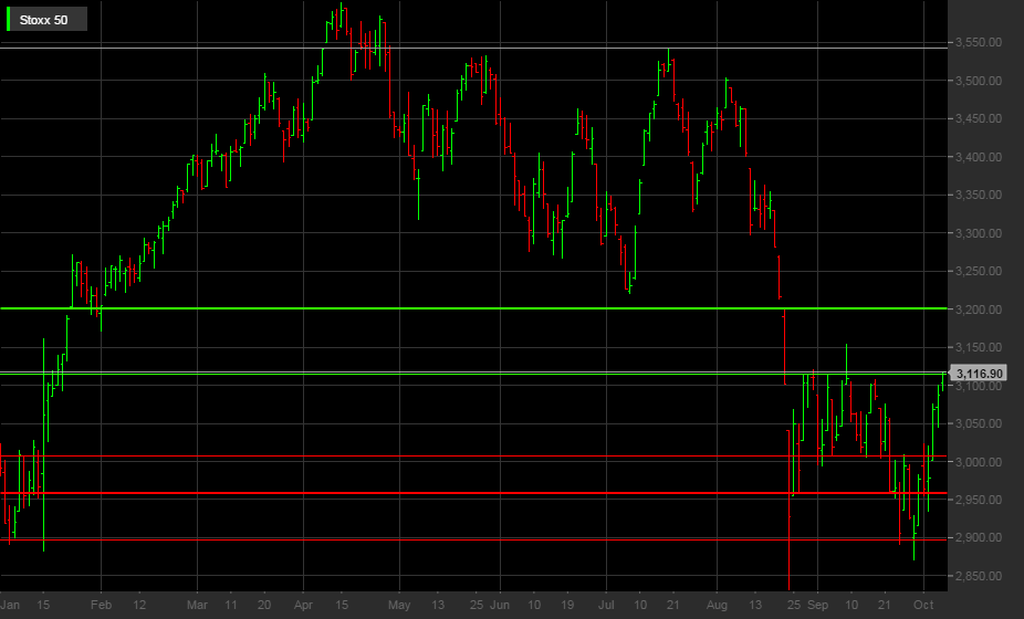 L’Euro Stoxx 50, dopo aver stoppato la sua discesa senza toccare nuovamente i minimi del 24 Agosto, in sole 6 sedute è rimbalzato ed è passato da 2900 punti a 3110 segnando quasi un 7% di rialzo.