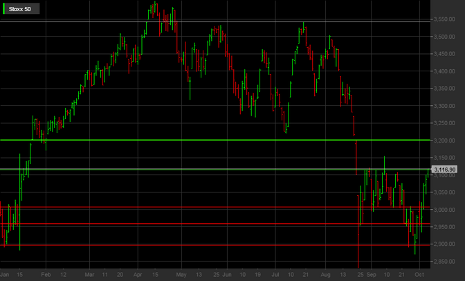 Raggiunta la resistenza di 3110, se non riuscisse a superarla l’Euro Stoxx 50 avrebbe davanti solo la strada del ritraccio.