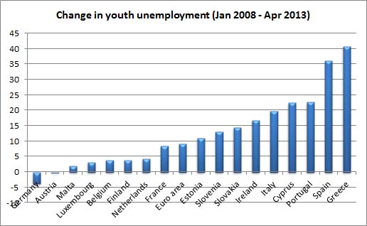 - I problemi della Grecia sono ben documentati, ma anche qualche grande economia ha dei seri problemi con la disoccupazione giovanile. Nel mese di aprile essa era pari al 56,4% in Spagna, al 42,5% in Portogallo e al 40,5% in Italia.