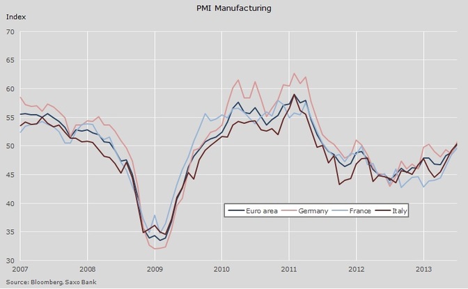 I responsabili degli acquisti nell’area dell’euro non erano così positivi da ben 26 mesi, in base ai numeri registrati dall’edizione di agosto del PMI manifatturiero. Nonostante l’umore migliore tra le aziende, sarebbe bene sottolineare che la ripresa nella zona euro sarà probabilmente protratta a fronte della continua austerità e per la riparazione dei bilanci.
