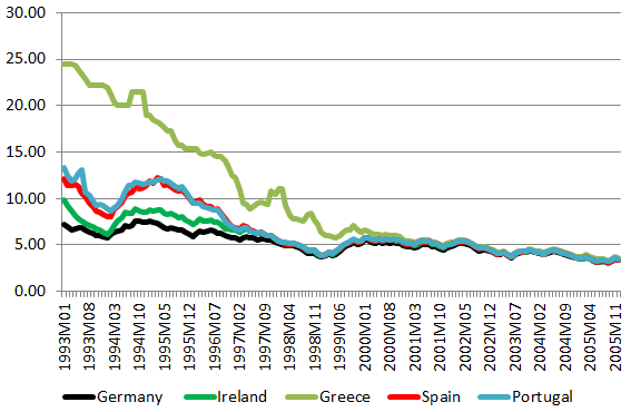 D’altra parte, negli anni dopo l’introduzione dell’euro, la Germania ha intrapreso riforme dolorose del suo stato sociale e del suo mercato del lavoro La scarsa performance economica della Germania alla fine degli anni ’90, i costi accumulati della riunificazione e le tendenze demografiche sfavorevoli avevano posto il sistema di welfare a dura prova. Perché l’euro non ha avuto in Germania lo stesso effetto che ha avuto nei paesi periferici come Spagna, lrlanda, Grecia e Portogallo - vale a dire, di rinviare le riforme? A nostro avviso, e coerenti con la nostra ipotesi, la risposta si trova nei percorsi di tassi di interesse indicati nella figura 1. Per la Germania, l’euro ha portato a più stretti vincoli di bilancio e fiscali, ma non a condizioni finanziarie più allentate. Assente il margine di manovra fornito da un boom finanziario, i politici non hanno avuto altra scelta se non quella di agire.