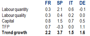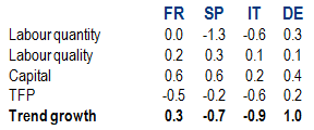 Mentre la crescita del capitale e della produttività hanno sollevato la crescita del PIL nei paesi del nord della zona euro, con poco contributo dalla crescita del lavoro, il contrario si è verificato in Spagna e in Italia. La produttività è stata piatta in Italia e negativa in Spagna, ma la crescita del capitale e del lavoro, in particolare la quantità di lavoro, hanno gonfiato la crescita del PIL.