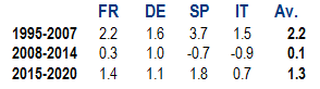 I risultati dal periodo pre-crisi crisi sono in linea con la maggior parte delle stime (Figura 1): la Spagna ha avuto la maggiore crescita tendenziale (3,7% annuo, grazie ad un aumento di capitale e una bassa manodopera qualificata), seguita dalla Francia, con la Germania e l’Italia che occupano le posizioni più basse a causa del modesto contributo della manodopera nella prima e della scarsa produttività nella seconda (vedi tabella 1).
