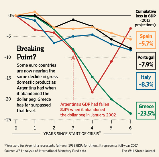 Quanto è simile la situazione del sud Europa oggi? L’economia argentina aveva subito una contrazione di circa l’8% nei tre anni precedenti la rivolta. Entro la fine di questo anno, le economie di Italia e Portogallo si saranno ridotte di circa l’8% rispetto al loro picco, la Spagna di circa il 6% e la Grecia di oltre il 23%, secondo il Fondo Monetario Internazionale.