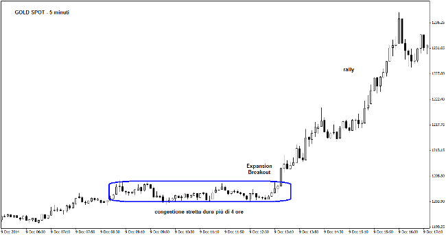 Per funzionare meglio il pattern deve presentare una chiusura vicina al massimo o al minimo, a seconda della direzione del breakout. Un esempio di Expansion Breakout su base intraday è quello mostrato in alto sul grafico a 5 minuti del Gold spot, interessato da una lunga e stretta congestione durata più di 4 ore. La rottura rialzista è sancita da un bellissimo Expansion Breakout, che dà il via a un rally spettacolare nelle ore successivo. Il valore dell’oro spot passerà da area 1.210$ a 1.238$.