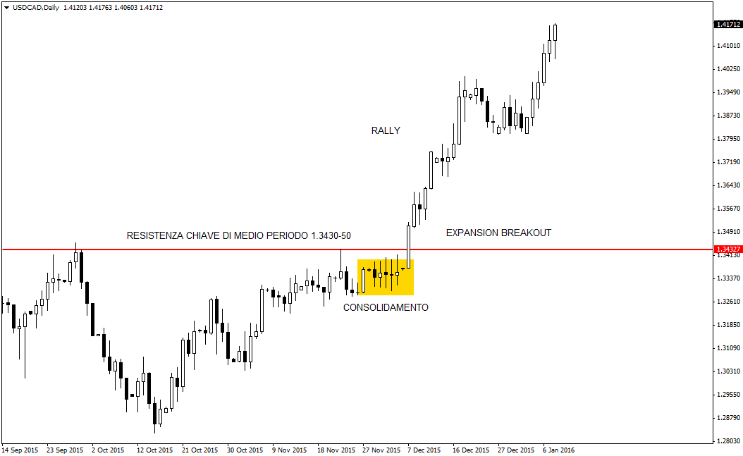 Il grafico mostrato in alto si riferisce al tasso di cambio USD/CAD, il cosiddetto “Loonie”, analizzato su un time frame giornaliero. Si può notare una iniziale fase di consolidamento sotto una zona di resistenza chiave del prezzo, posta intorno a 1,3430 – 1,3450. La compressione della volatilità provoca un boom dei prezzi al di sopra di questo key level, mostrando uno spettacolare Expansion Breakout. E’ il segnale long che farà partire un rally da 700 pip in un mese.