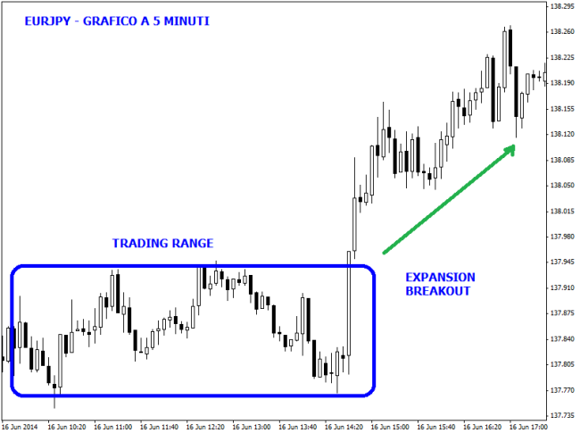 Il grafico a 5 minuti mostrato in alto è riferito alla coppia forex euro su yen giapponese (EurJpy), che evidenzia un ampio trading range intraday. All’improvviso i prezzi scattano verso l’alto, formando una long candle che supera l’estremo alto della fase laterale. La chiusura sui top della candela è molto significativa e indica che i Tori hanno probabilmente preso possesso del mercato. L’Expansion Breakout si è formato, per cui si può entrare long in ottica di scalping puntando in genere su un rendimento pari ad almeno due volte il rischio iniziale.