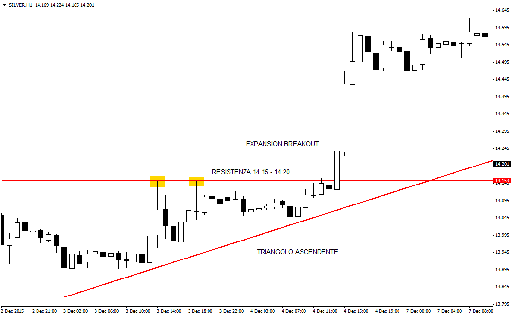 Il grafico mostrato in alto è riferito al mercato cash dell’argento, analizzato sul time frame intraday a 60 minuti. Si può notare come avvenga un notevole boom delle quotazioni, a seguito della comparsa di un netto Expansion Breakout di un triangolo ascendente. In poche ore il valore dell’argento aumenterà del 3%, con profitti significativi per i Tori.
