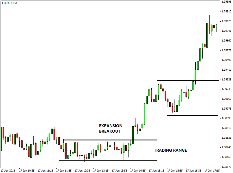 Come si può notare dal grafico del tasso di cambio Eur-Aud, ovvero euro su dollaro australiano, time frame a 5 minuti, i prezzi effettuano un bellissimo expansion breakout mettendosi alle spalle una fase laterale che durava da più di due ore. Dopo la formazione del pattern si può pensare di entrare long con lo stop loss sotto il minimo del trading range. Il target è posto a circa due volte il rischio iniziale.