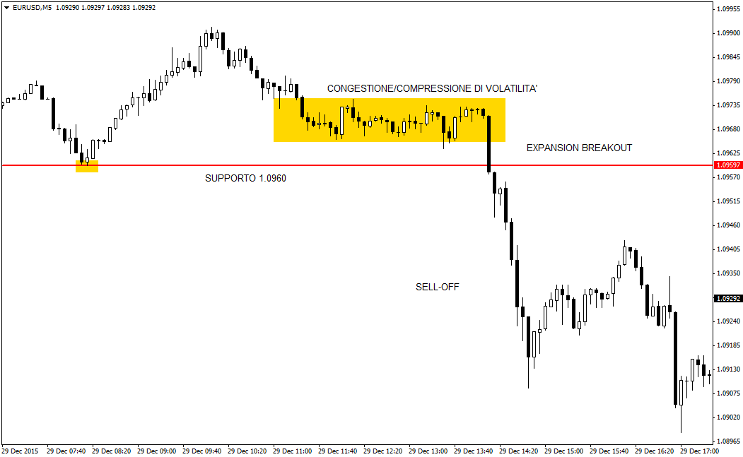 Il grafico intraday mostrato in alto sul tasso di cambio Euro/Dollaro, time frame a 5 minuti, evidenzia un tipico Expansion Breakout formatosi a seguito di una stretta congestione dei prezzi. La compressione di volatilità avrà un “effetto-elastico” sui prezzi al dir poco eccezionale, favorendo un significativo movimento ribassista di oltre 60 pip dopo la perdita del supporto chiave di breve periodo.