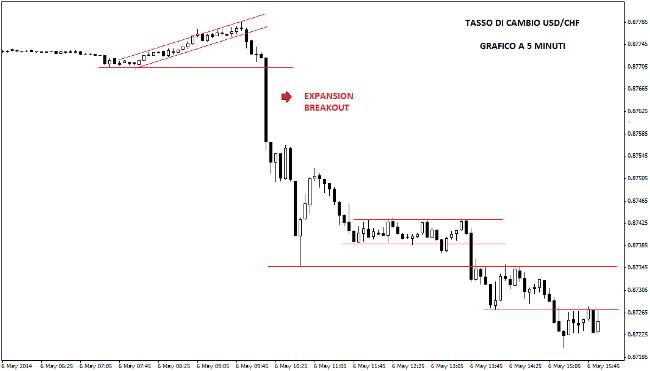 Abbiamo già visto diverse volte come il pattern Expansion Breakout sia in grado di individuare i migliori breakout del mercato, filtrando così i falsi segnali in genere ricorrenti in queste situazioni. Il boom dei prezzi individuato da questo particolare pattern consente al trader di entrare in linea con la tendenza principale del mercato, cavalcando ulteriormente il trend nel corso della giornata di trading. Il pattern funziona molto bene sia sul time frame giornaliero sia su quello intraday a 5 minuti, ottimo per fare scalping o day-trading. L’esempio mostrato in basso evidenzia tutta la potenza di questo segnale.