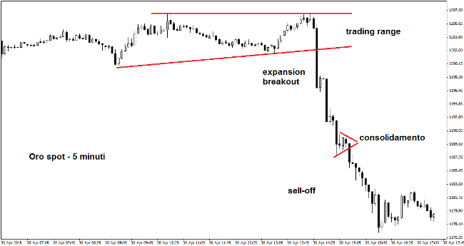 In alto è stato mostrato il grafico intraday dell’Oro spot (o Gold spot), time frame a 5 minuti, che evidenzia un Expansion Breakout ribassista davvero molto netto, che appare dopo una fase di distribuzione piuttosto lunga sui massimi di giornata. A seguito del breakout, i prezzi inizieranno una sontuosa discesa senza mettere a punto grossi pullback. Il day-trader poteva approfittare di questo sell-off per implementare una transazione short ad elevata redditività.