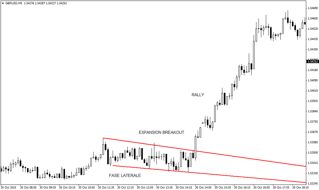 L’Expansion Breakout è un sistema basato sui breakout davvero molto interessante, che permette di gestire operazioni dal potenziale guadagno elevato. I migliori setup sono quelli che scaturiscono dalla rottura di una resistenza o di un supporto di una fase laterale, meglio ancora di congestioni con bassa volatilità. E’ il caso, ad esempio, del tasso di cambio Sterlina/Dollaro a 5 minuti mostrato in alto: l’Expansion Breakout di una lunga fase laterale dà il via un rally davvero eccezionale.
