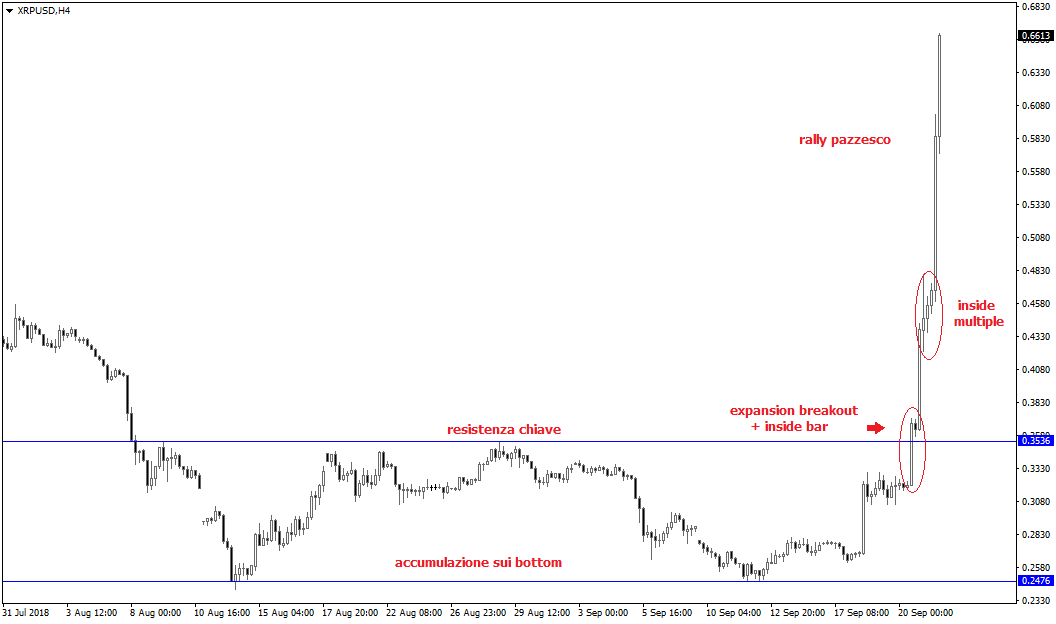 A un certo punto iniziano a formarsi candele ad ampio range rialziste. La più importante è l’expansion breakout che rompe l’equilibrio, superando di forza la resistenza chiave. Da questo momento in poi Ripple diventa una furia incontenibile: i prezzi schizzano con una violenza inaudita, grazie anche a brevissimi consolidamenti (le candele inside), che favoriscono ulteriori accumulazioni nel breve termine. Da area 0,35 si giunge oltre 0,66 nel giro di qualche giorno.
