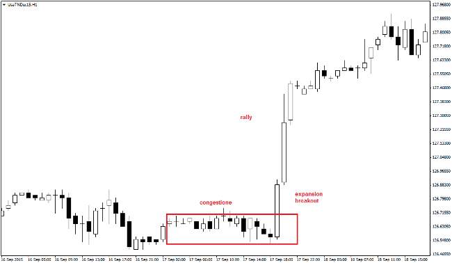 Il pattern, ideato per il trading multiday da Jeff Cooper, è perfetto anche per l’attività di scalping e day trading. Lo si può notare anche dal grafico a 60 minuti mostrato in alto sul CFD sul T-Note Usa decennale. Il bond americano mostra dapprima una fase di congestione sui bottom intraday e poi esplode al rialzo, a seguito della pubblicazione di un importante market mover. L’Expansion breakout indica la possbilità che il mercato è pronto a un significativo rally di breve periodo.