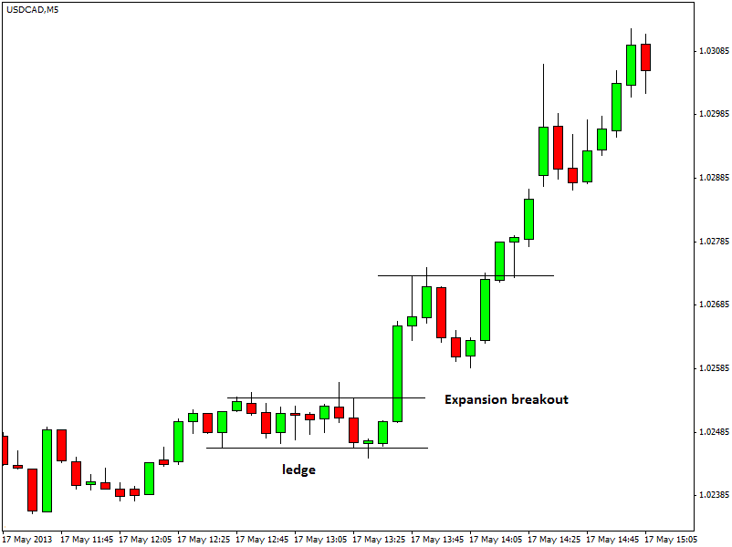 Oggi andiamo ad analizzare un expansion breakout formatosi dopo un ledge. In questo caso abbiamo un segnale di trading molto forte, in quanto viene abbinato un classico breakout di una micro-congestione a una candela di espansione del range. L’esempio mostrato in basso si riferisce al tasso di cambio Usd/Cad, ovvero dollaro americano su dollaro canadese. Il time frame di analisi è il 5 minuti.