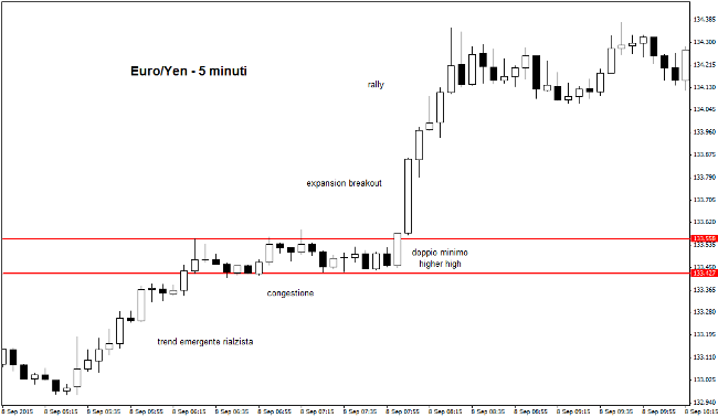 L’esempio grafico mostrato oggi, relativo all’andamento intraday del tasso di cambio EUR/JPY, ovvero Euro contro Yen giapponese, evidenzia la formazione di nitidi segnali rialzisti a seguito dell’avvio di un bullish trend emergente. Il grafico a 5 minuti in basso mostra un significativo rally sui mercati asiatici e poi una lunga e stretta congestione dei prezzi, in attesa dell’apertura delle borse europee. A un certo punto appare il primo segnale rialzista, ovvero un doppio minimo higher high con chiusura estrema.
