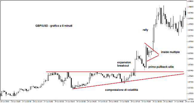 Il chart esibito in alto si riferisce al tasso di cambio sterlina/dollaro (GBP/USD), il “Cable”, sul quale si forma una lunga compressione di volatilità all’interno di un triangolo ascendente. A un certo punto si forma un Expansion Breakout, che darà l’opportunità di entrare long anche sul primo fisiologico pullback dopo lo strappo bullish. In poco tempo il Cable guadagnerà almeno 50 pip dal momento del breakout.