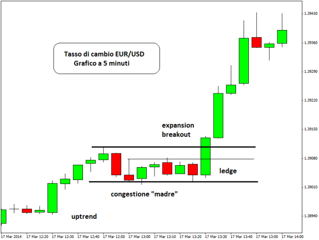 Dal grafico in alto relativo al tasso di cambio euro/dollaro, time frame a 5 minuti, si può notare un trend intraday rialzista che sperimenta una breve fase laterale dopo la formazione di un nuovo top di giornata. All’interno della congestione “madre” si forma un ledge, che identifica una fase di consolidamento del precedente bullish trend. All’improvviso si forma un expansion breakout, che segnala allo scalper una buona opportunità long. Il rapporto rischio/rendimento è pari a 1:2, quindi molto vantaggioso per questo stile di trading.