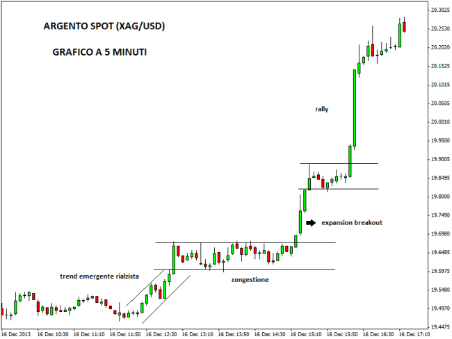 Se osserviamo il grafico in alto dell’argento, time frame a 5 minuti, possiamo notare la formazione di una stretta congestione dei prezzi che dura circa due ore. In questa fase di mercato i large traders accumulano grosse quantità di contratti senza dare troppo nell’occhio, prima di spingere definitivamente al rialzo i prezzi. Il breakout è subito convincente, ma il vero segnale avviene con la candela successiva: expansion breakout intraday! La quotazione aumenterà velocemente, passando da 19,75$ a 20,30$ circa in meno di due ore.