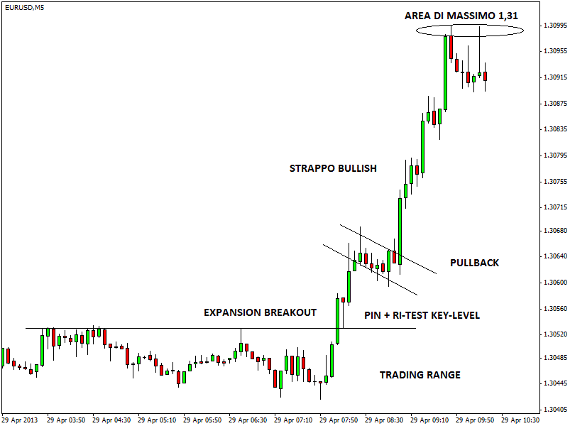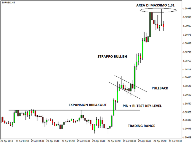 Ancora una volta vorrei soffermarmi sul pattern EXPANSION BREAKOUT "intraday", un segnale di trading altamente competitivo e in grado di assicurare spesso ottimi guadagni al ricorrere di determinate condizioni. Come si evince dal grafico in basso, il pattern si forma intorno alle ore 8 e rompe al rialzo una lunga fase laterale avvenuta nel corso della sessione asiatica. Il breakout della micro-resistenza di 1,3053 viene confermato poco dopo con un ri-test del key-level con una pin candle.