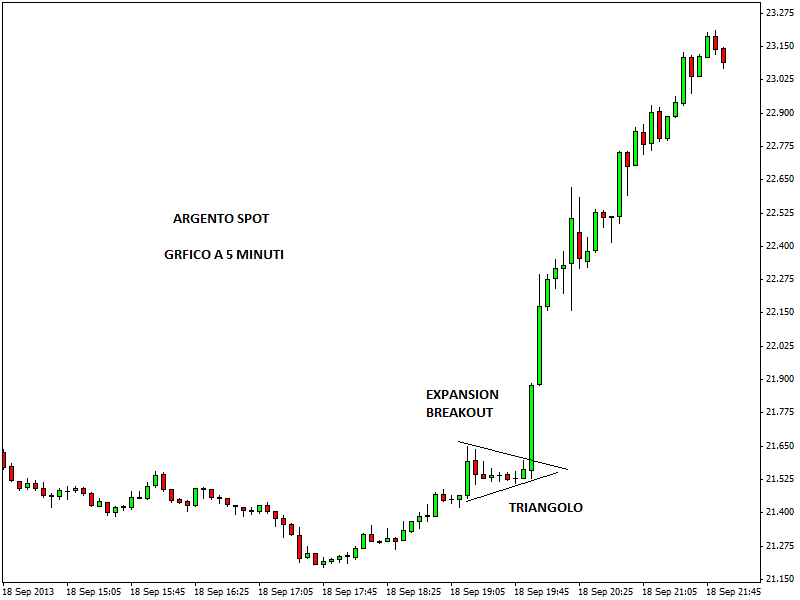 Un esempio che mostra al meglio le potenzialità del pattern expansion breakout è quello relativo all’argento spot (o silver). Se osserviamo il grafico a 5 minuti, possiamo subito notare che il mercato si è mosso lateralmente per diverse ore. Dopo la formazione di un triangolo, ecco che scatta il segnale derivante dall’expansion breakout! Il boom dei prezzi è eccezionale, favorito anche dalla decisione della FED di non ridurre il programma di acquisto degli asset che va avanti da oltre 4 anni.