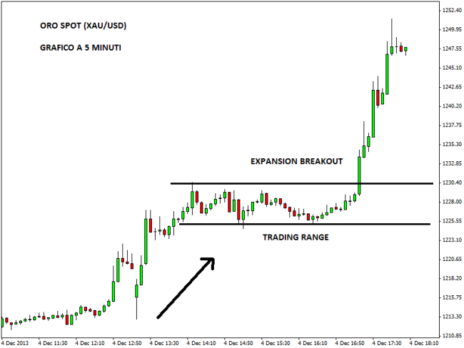 Per capire meglio i concetti finora espressi soltanto a parole, andiamo a studiare il grafico in alto di XAU/USD, time frame a 5 minuti. L’oro inizia a muoversi al rialzo nel primo pomeriggio dopo la pubblicazione di un dato macroeconomico pubblicato negli Stati Uniti. Dopo aver raggiunto la micro-resistenza di 1.230$, inizia a formare un trading range che durerà per quasi tre ore. Il segnale long arriva quando appare l’expansion breakout. L’ingresso avviene a 1.233$: in poco più di 30 minuti i prezzi saliranno fin sopra 1.250$, offrendo quindi un’ottima opportunità di profitto.