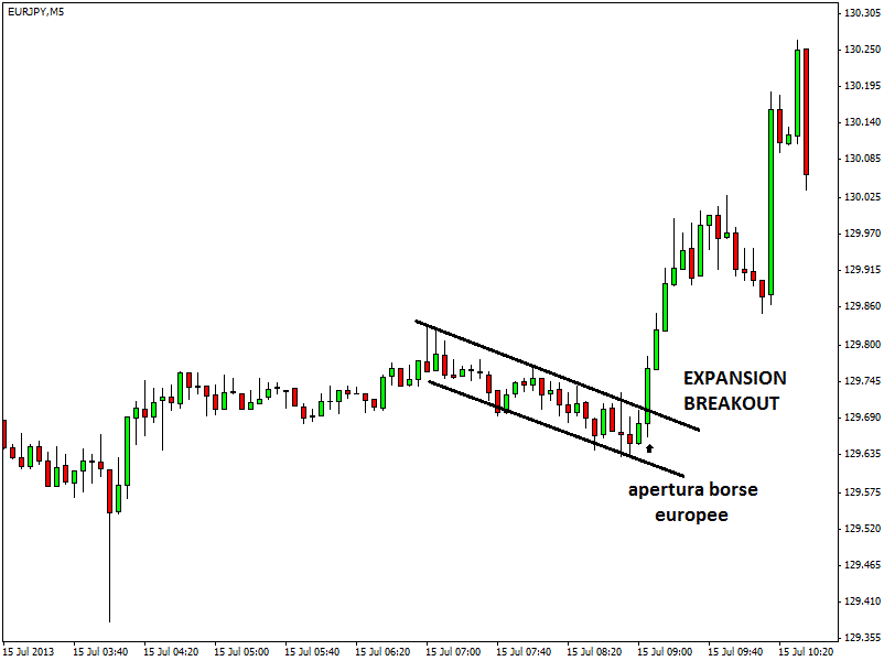 Per comprendere meglio l’argomento andiamo a vedere cosa è successo sul cambio euro-yen, time frame a 5 minuti, pochi istanti dopo l’apertura delle contrattazioni sulle borse europee. Il mercato si muove velocemente al rialzo, offrendo una buona opportunità long a seguito della comparsa del pattern noto come expansion breakout: la volatilità aumenta e anche l’estensione media delle candele, dopo una breve fase di congestione.