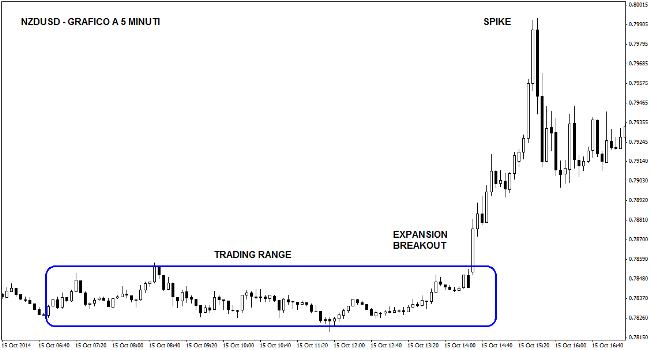 Il grafico mostrato in alto si riferisce al tasso di cambio NZDUSD, ovvero il rapporto di cambio tra il dollaro neozelandese e il dollaro statunitense. Il time frame di osservazione è il 5 minuti, perfetto sia per gli scalper che per i day trader. Si può notare che il trading range si protrae per diverse ore. La rottura avviene con un bellissimo expansion breakout, che diventa il segnale d’acquisto in grado di individuare il timing di entrata perfetto al trader di breve termine. Il Kiwi salirà tantissimo, guadagnando oltre 100 pip in poco più di un’ora.