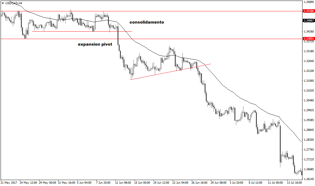 L’esempio mostrato in alto sul tasso di cambio USD/CAD, il cosiddetto “Loonie” nel gergo dei forex trader delle sale operative, time frame a 4 ore, mostra un enorme expansion pivot che effettua il breakout di un’ampia fase di consolidamento. La rottura ribassista è superlativa: i prezzi crollano vertiginosamente, salvo un iniziale pullback fisiologico che non consente però ai Tori di reagire in maniera efficace alla pressione esercitata dai venditori. Il sell-off farà cadere la quotazione da area 1,3385 (punto di breakout) a poco più di 1,26. Un vero e proprio tracollo!