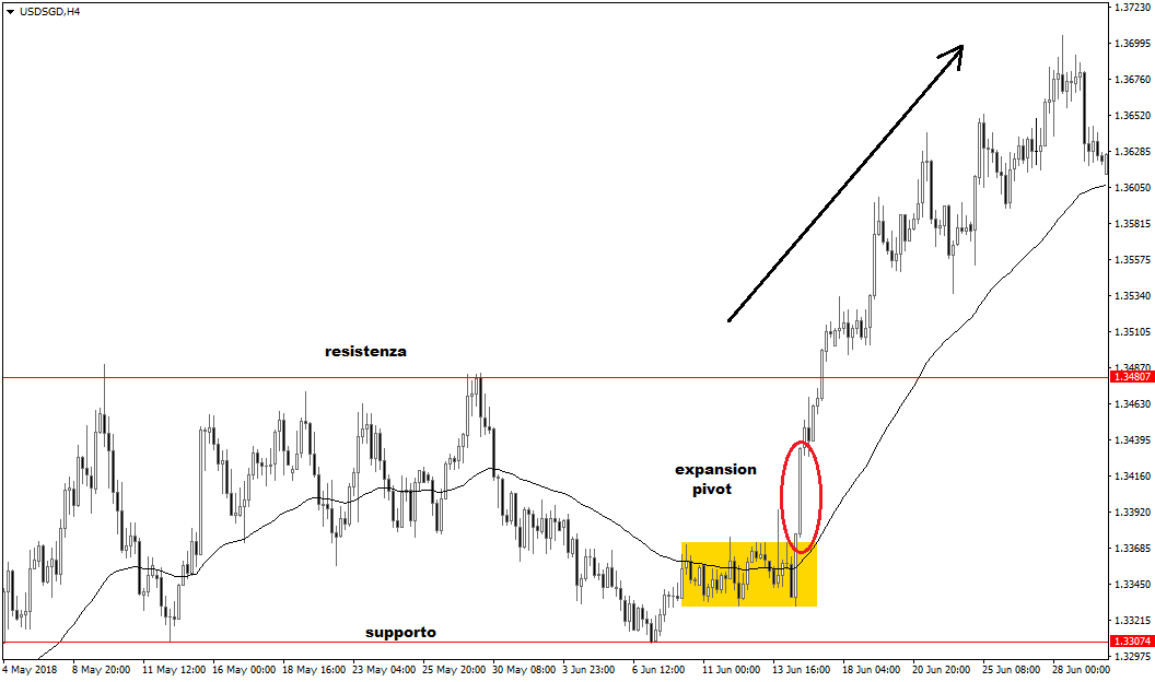 Il setup può essere utilizzato su qualsiasi time frame, ma funziona meglio sul daily e il 4 ore. La media mobile migliore da utilizzare è quella esponenziale (EMA). Il grafico mostrato in basso evidenzia un case study relativo a un netto expansion pivot apparso sul cambio USD/SGD durante una fase laterale di accumulazione sui bottom. L’entrata avviene a mercato dopo la formazione del setup, con stop loss sotto il minimo della long candle. Grazie a questo segnale era possibile mettere a segno un rendimento pari anche a oltre 4 volte il rischio iniziale nel giro di pochi giorni.