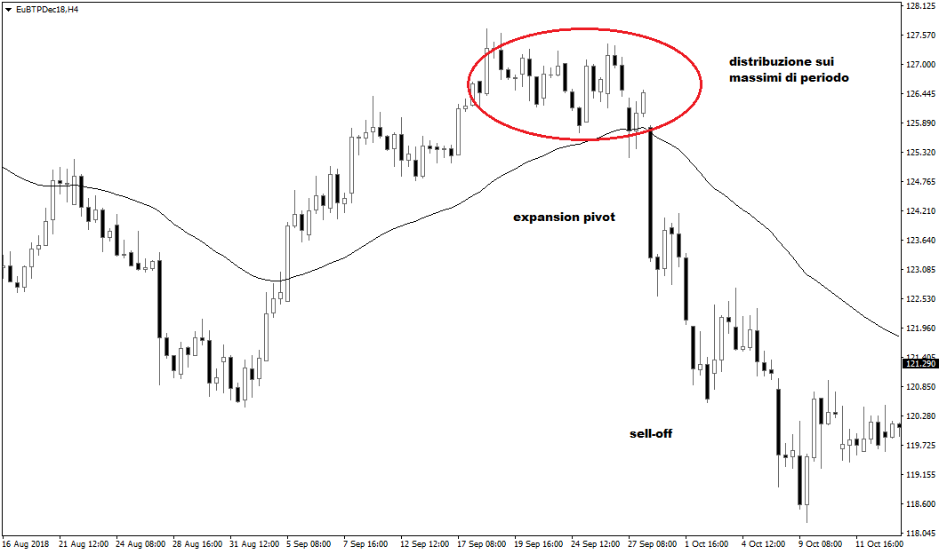 Ed è un po’ quello che è successo sul CFD relativo al future del BTP, ovvero il titolo di stato italiano decennale. Il grafico in alto a 4 ore evidenzia come l’expansion pivot abbia dato il via a un solido movimento direzionale ribassista, dopo una fase laterale sui top di periodo. Nel giro di pochi giorni la quotazione del BTP passerà da area 124 a poco più di 118, facendo impennare il valore dello spread BTP-Bund, ovvero il differenziale tra i tassi di interesse del titolo di stato di riferimento italiano e quello pari scadenza tedesco.
