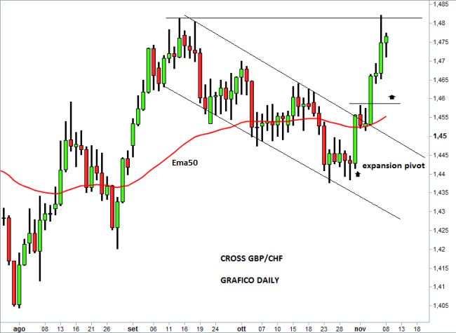 Oggi andiamo a dare un’occhiata a un caso di studio molto interessante, che mostra un bellissimo movimento rialzista avvenuto sul tasso di cambio Gbp/Chf, ovvero sterlina su franco svizzero, a seguito della comparsa di un pattern noto come expansion pivot. Questo segnale, ideato dal noto trader americano Jeff Cooper, identifica un’esplosione della volatilità, e quindi dei prezzi, in grado di dare il via a un movimento direzionale di breve-medio periodo. Analizziamo il grafico daily per capire meglio il pattern.