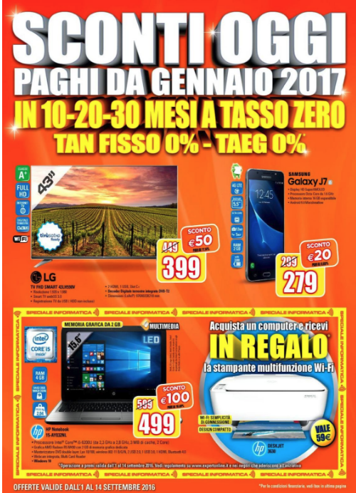 Ma le offerte non terminano qui: i prodotti informatici ed elettrodomestici acquistati con gli sconti di settembre 2016 presso i negozi Expert possono essere pagati a partire da gennaio 2017 in 10-20-30 mesi a tasso zero TAN fisso 0% e TAEG 0%.