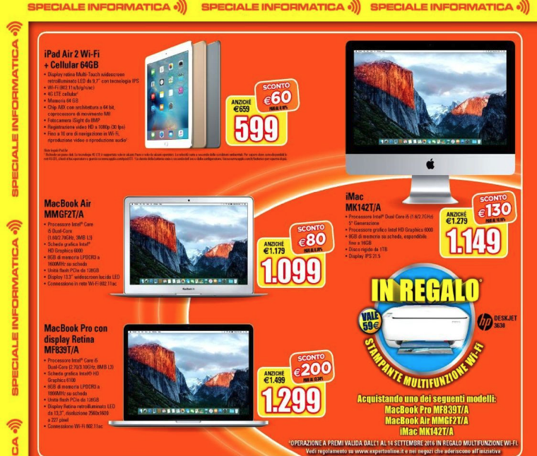 Passando a Apple, l’offerta migliore del volantino Expert di settembre 2016 è sul MacBook Pro con display Retina da 13,3". Si risparmiano 200€ visto che il prezzo scontato è di 1.299€ da Expert.
