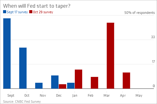 Quando inizierà il tapering della Federal Reserve? È questo uno dei temi che domina la scena sui mercati finanziari di tutto il mondo e visto che è ormai vicino l’appuntamento con il meeting FOMC (prevista domani sera la comunicazione ufficiale). La Cnbc, leader mondiale nel campo dell’informazione finanziaria, ha pubblicato oggi l’ultimo sondaggio in materia, mettendo a confronto i dati con quelli rilevati a settembre (la data che era stata individuata come possibile avvio della riduzione degli acquisti).