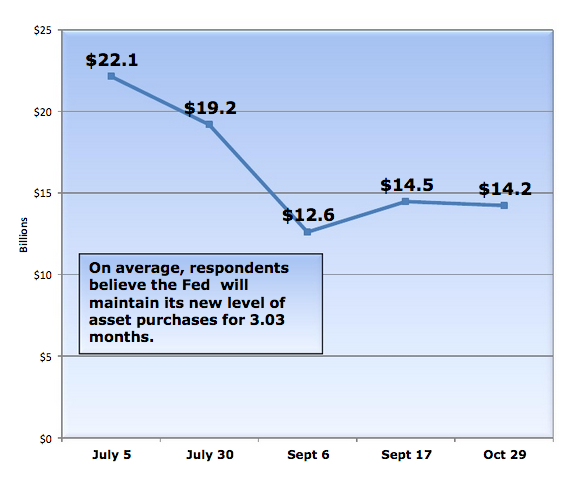 Secondo il parere di 40 esperti tra analisti, economisti e top manager di Wall Street, il piano di stimolo monetario da 85 miliardi di dollari al mese rimarrà in atto fino ad Aprile 2014 notando, tra l’altro, come la decisione di non ridurre gli acquisti a settembre sia stata una "mossa saggia", viste le attuali condizioni economiche statunitensi e dato lo shutdown del governo federale.